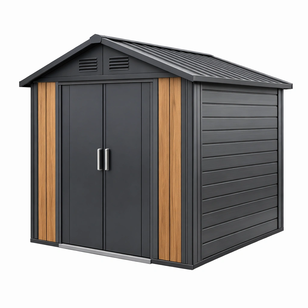 Der Schuppen verfügt über ein Schrägdach und Belüftungsschlitze für Luftzirkulation.
