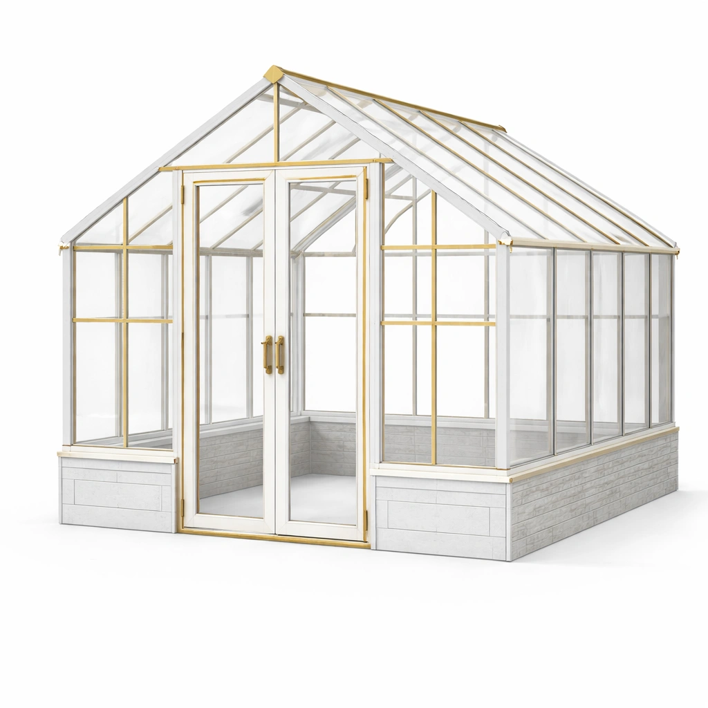 Das Gewächshaus besteht aus einem stabilen Aluminiumrahmen und 8 mm starkem Einscheibensicherheitsglas (ESG). Die Hauptfarbe des Rahmens ist Weiß mit goldenen Akzenten.